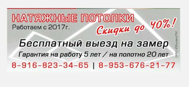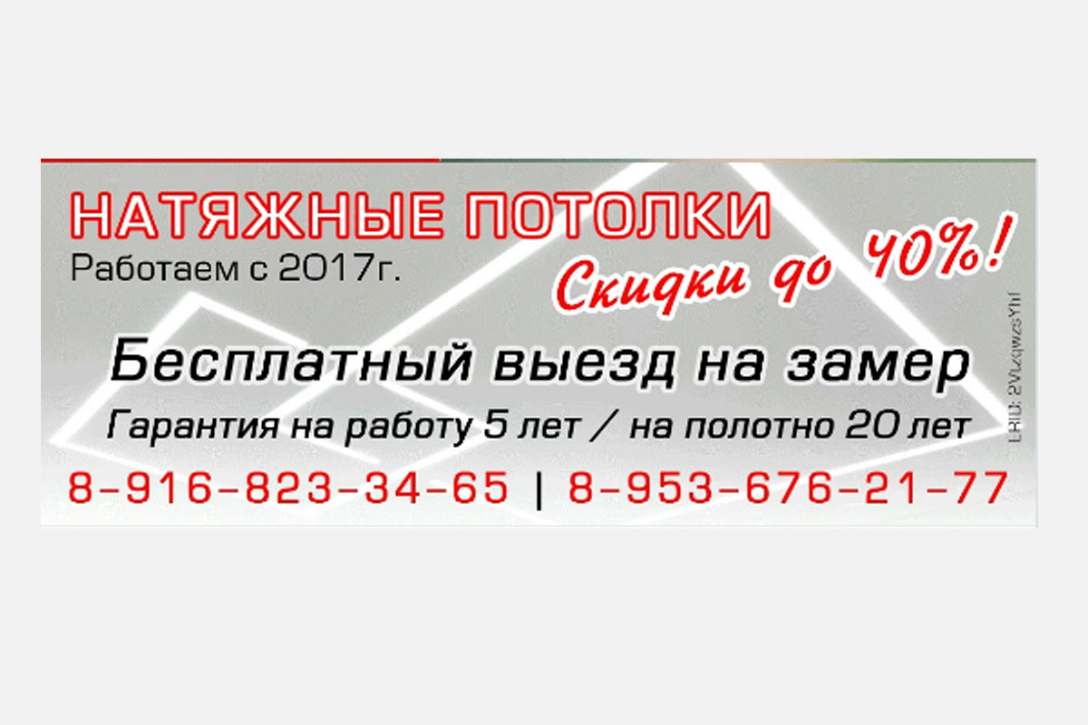 Натяжные потолки со скидкой! На чтение 1 мин Просмотров 1 -/1 (Мастера) Опубликовано: 20.10.2025 (23 секунды назад) Рубрика Услуги Натяжные потолки. СКИДКИ до 40! Бесплатный выезд на замер Работаем с 2017 года Гарантия!!! Показать контактную информацию