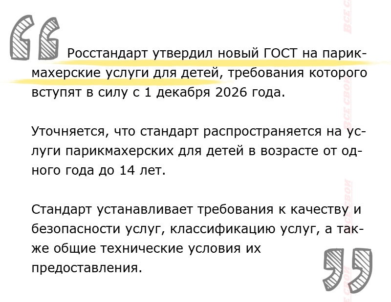 При этом в парикмахерской для детей не допускается проведение химических выпрямлений, завивок, кератиновых и аналогичных процедур, постоянных окрашиваний и осветлений, косметического татуажа, пирсинга, перманентного макияжа, а также медицинских и косметологически процедур.