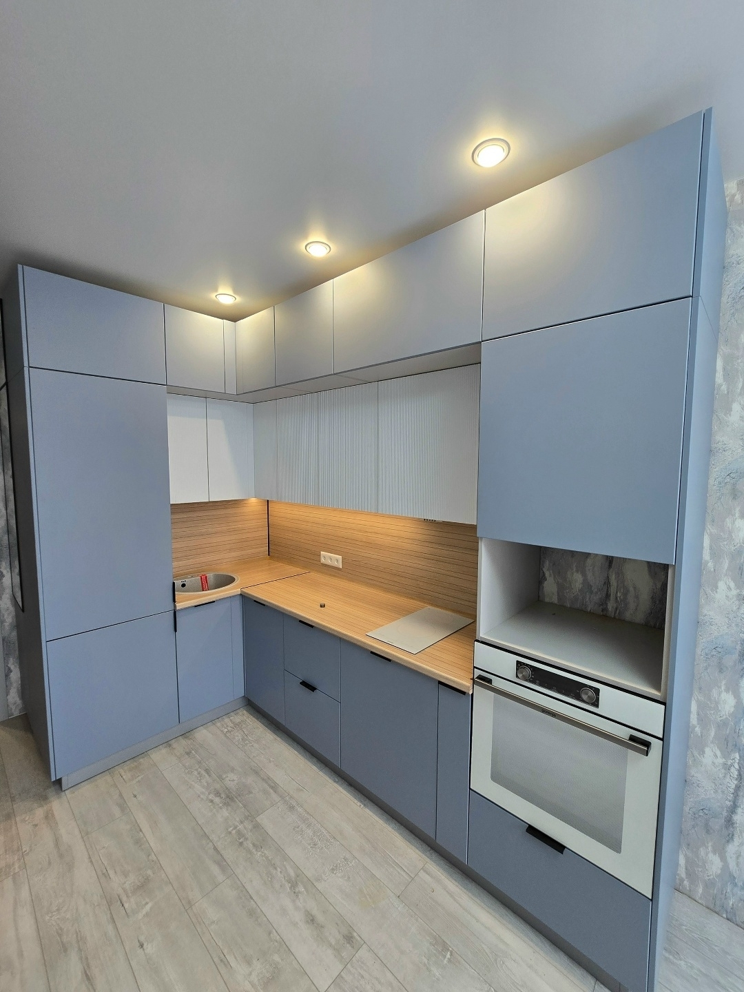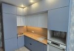 Особенностью этого проекта является покрытие Акрилит. Оно объединяет преимущество пластикового покрытия и эмали, делая кухню и фасады более устойчивыми к любым загрязнениям и химикатам.