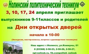 Нолинский политехнический техникум приглашает на Дни открытых дверей