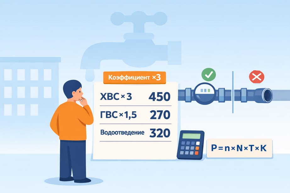 И ещё один принципиальный момент: без счётчика вы платите не за то, сколько воды реально потратили, а за норматив — усреднённое значение, рассчитанное на «среднестатистического жильца». Этот норматив почти всегда больше реального потребления экономного человека. Плюс повышающий коэффициент сверху. Именно здесь прячется переплата.