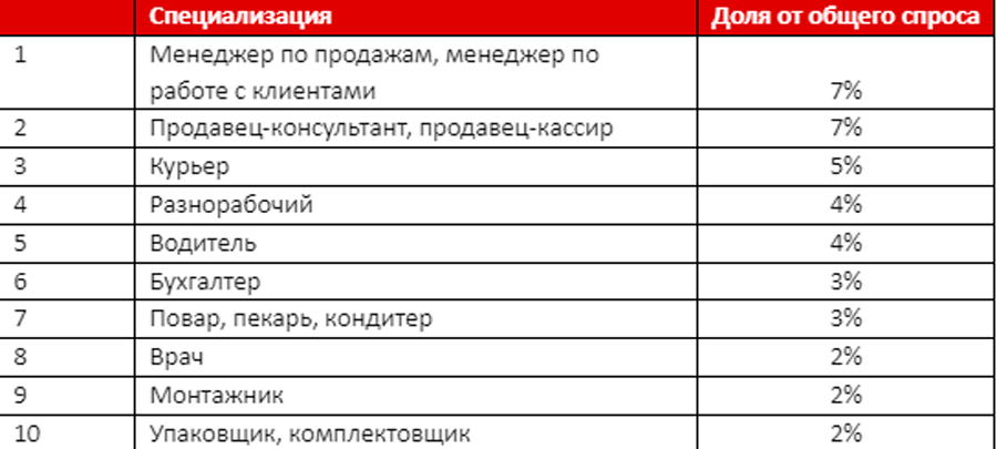 На втором месте — курьеры (5%). Далее по спросу идут разнорабочие и водители (по 4%). В список востребованных специалистов региона также вошли бухгалтеры, повара, пекари, кондитеры (по 3%), врачи, монтажники, упаковщики и комплектовщики (по 2%).