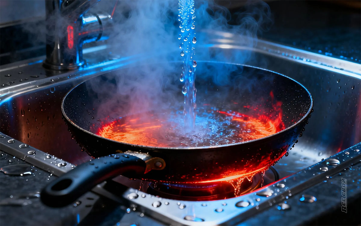 Давайте представим, что Вы дожарили картошку, сняли сковороду с огня — и сразу под кран… Холодная вода шипит, пар валит клубами! Вам кажется, что Вы — молодец: быстро, эффективно, чисто. Пока жир ещё легко смывается.