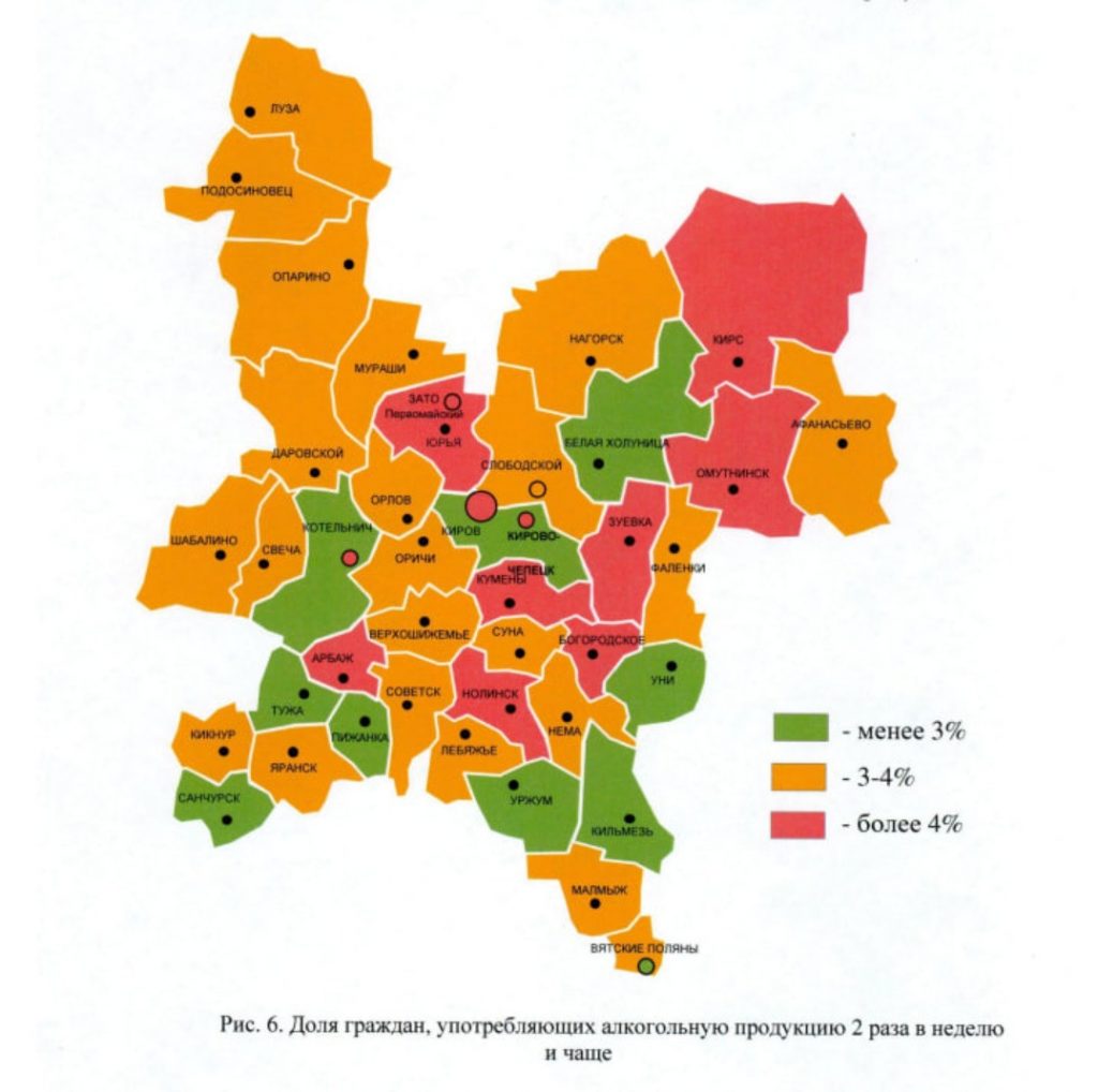 Наиболее низкая доля регулярно употребляющих алкоголь жителей — менее 3% — отмечена в отдельных муниципалитетах южной, юго-западной и восточной частей области. В их числе Кильмезский, Унинский, Санчурский, Кикнурский и некоторые другие…